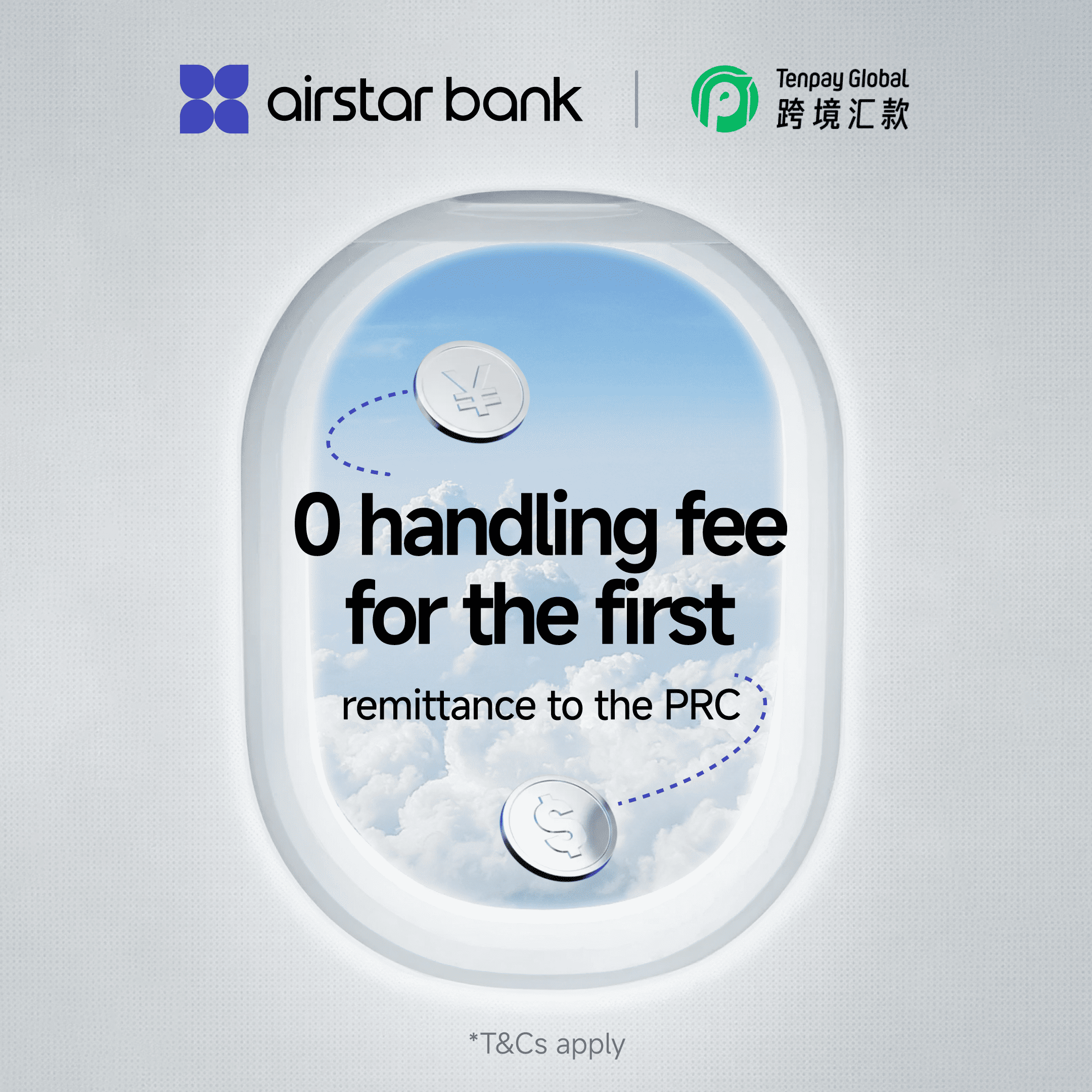During the promotion period, log in to the Airstar Bank App and use "Remit to Chinese Mainland·WeRemit" to enjoy 0 handling fee on your first transfer. One-time offer per customer. Limited quota, first come, first served. Transfer easier and cheaper now!